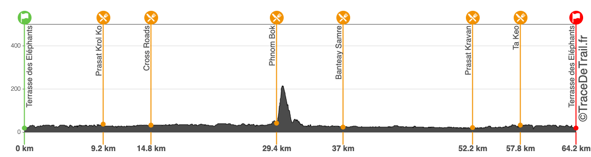 Le départ se fera à Cross Roads, à 6h00 du matin, au nord-est des temples d’ Angkor puis rejoindra le cœur du site archéologique d’Angkor via Phnom Bok où 700 marches à gravir vous attendent avec une vue splendide arrivé au sommet de la colline ou vous traverserez un petit temple. Profitez de ces moments exceptionnels avant de replonger sur Banteay Samre, Eastern Mebon, Prae Roup, Prassat Kravan, Tanéi, French Bridge pour rejoindre la ligne d’arrivée à la Terrasse des Eléphants.