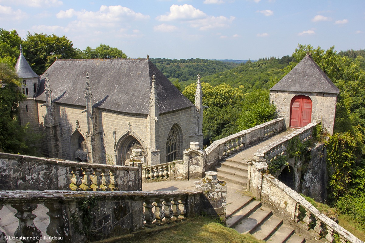 Au départ de la magnifique Halle du Faouët (XVIe siècle), vous quittez rapidement le bourg pour suivre les chemins sous couvert forestier, en direction de la Chapelle Ste Barbe. Après 1.5km de sentiers au profil plat, l’itinéraire vous mènera à la Chapelle droit dans l’pentu ! Une belle montée pleine de charme vous permettra d’atteindre rapidement la chapelle Sainte Barbe, nichée sur les hauteurs de la ville du Faouët, dans un écrin de verdure au pied d’abrupts rochers. Le temps de profiter de ce patrimoine remarquable, vous descendrez ensuite au bord de l’Ellé, rivière en fond de vallon que vous longerez sur plus d’un kilomètre, dans un cadre exceptionnel. Vous remonterez ensuite sur le plateau en passant par les ruines du château de Barregant puis le hameau éponyme. Vous reviendrez alors sur le Faouët par une succession de sentiers et chemins, dans un cadre bocager. Le dernier kilomètre se fera par l’itinéraire aller.