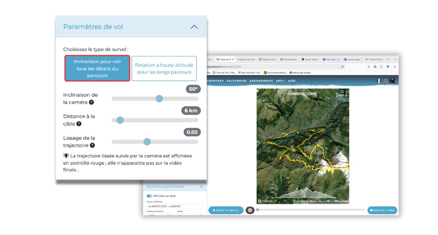 Ce mode de survol permet de voir tous les détails d’un parcours. Vous pouvez intervenir sur 3 paramètres :